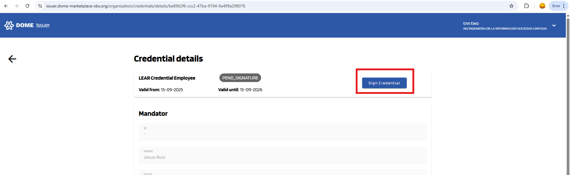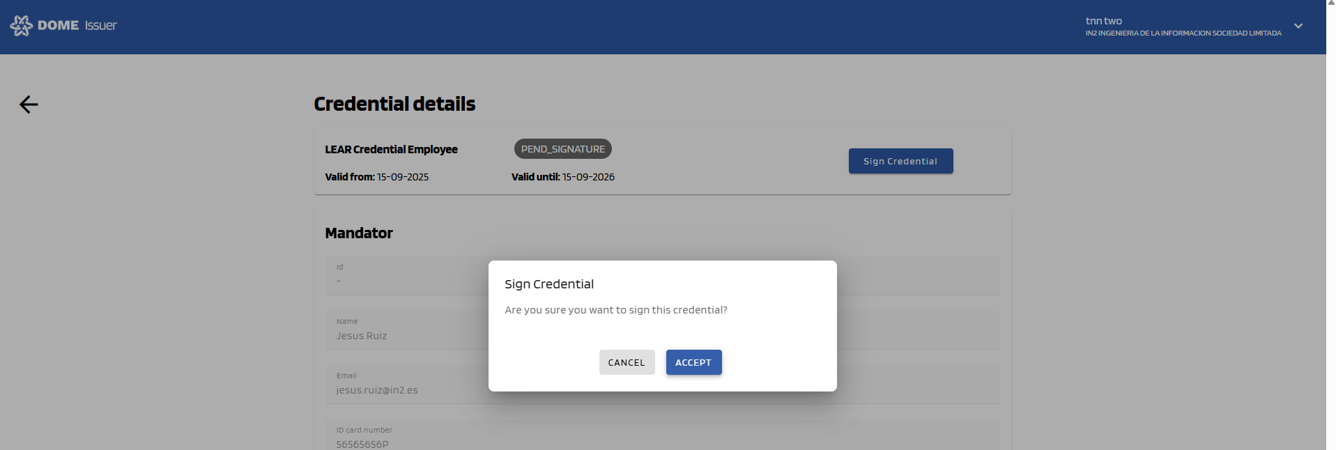 Click this button and then confirm to sign the credential manually. If the signing process completes successfully, you will see a confirmation message, and the credential status will update to "VALID" once you refresh the page.