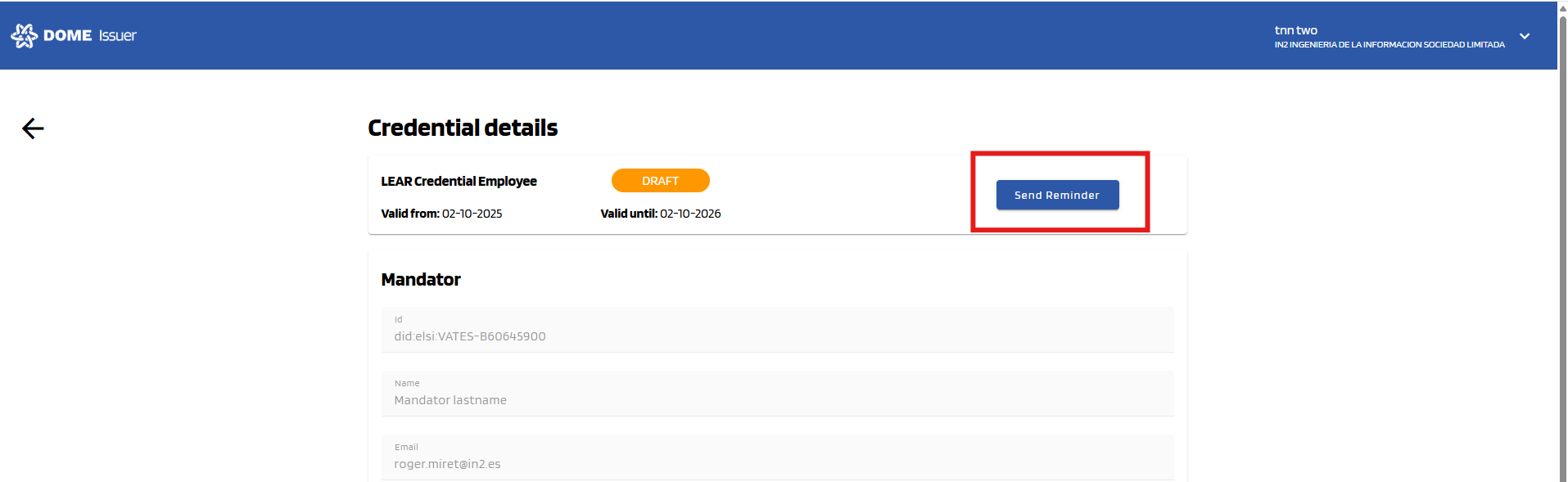 When a credential has status "DRAFT", you will see a "Send reminder" button in the "Actions" box. By clicking this and then confirming, a new email will be sent to activate the credential. Thus, this is useful when the credential offer has expired.
