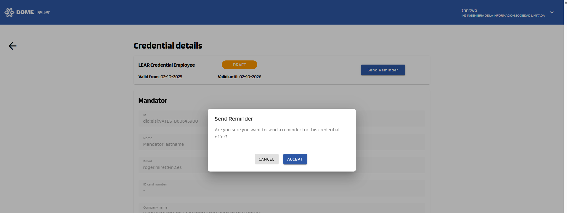 Notice: Clicking "Send reminder" will issue a new credential offer, which will invalidate the previous one. Use this action judiciously.