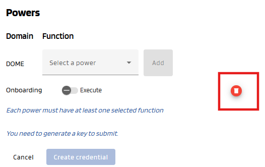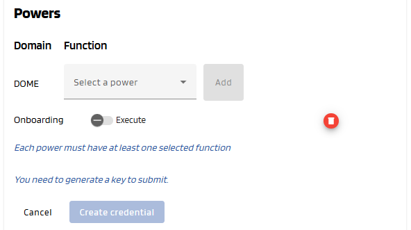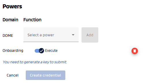 You can add different power functions using the combo box. Each power has one function. Add at least one power (=function) by selecting it in the selector and clicking to the "Add" button. For each added power, select at least one action (toggle buttons). In the example below, "Onboarding" is a function, and "Execute" are actions. The "Create credential" button is disabled because the Onboarding power doesn't have any actions.