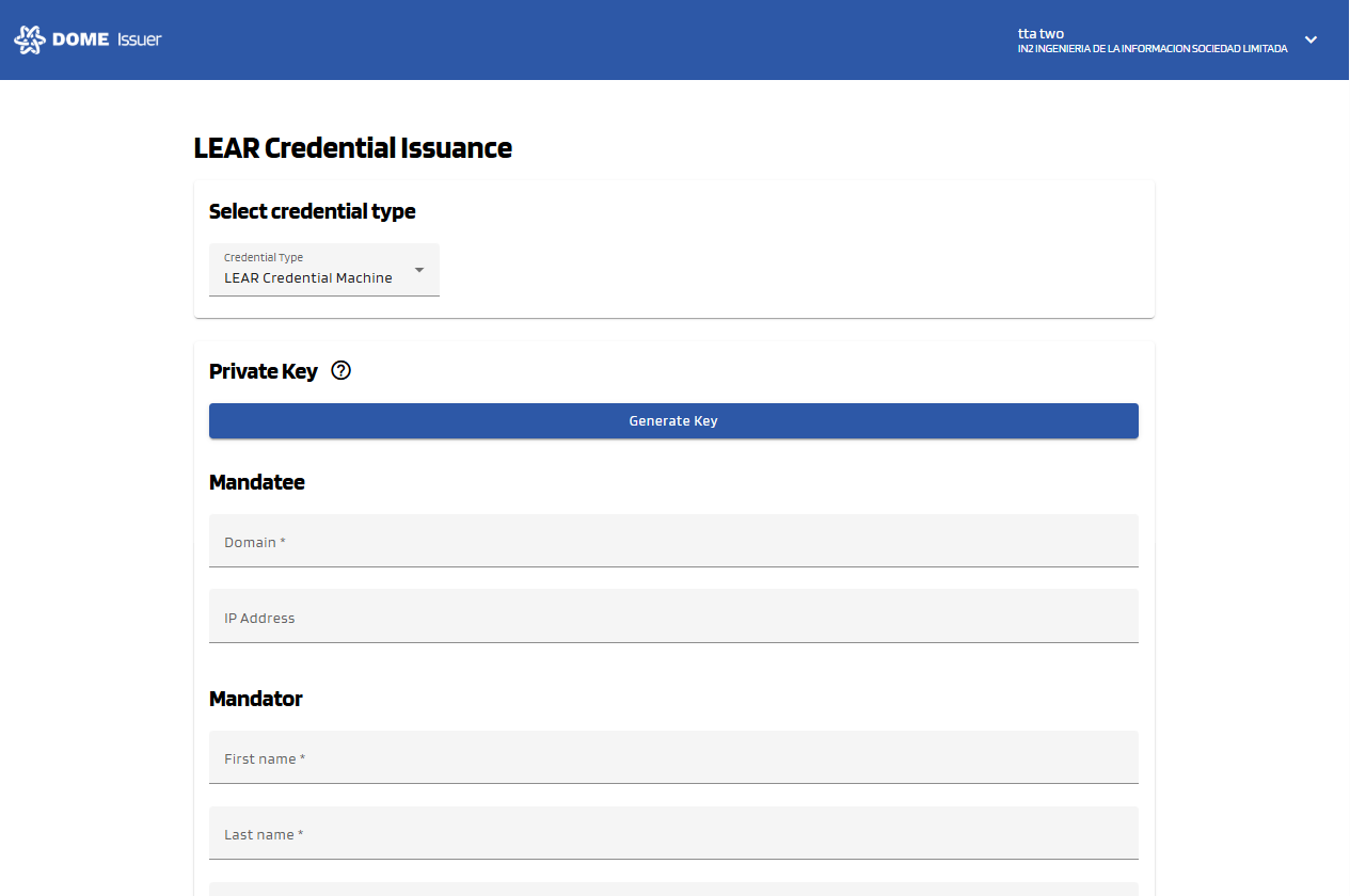 Select the LEAR Credential Machine type in the selector. Then the corresponding form will be displayed: