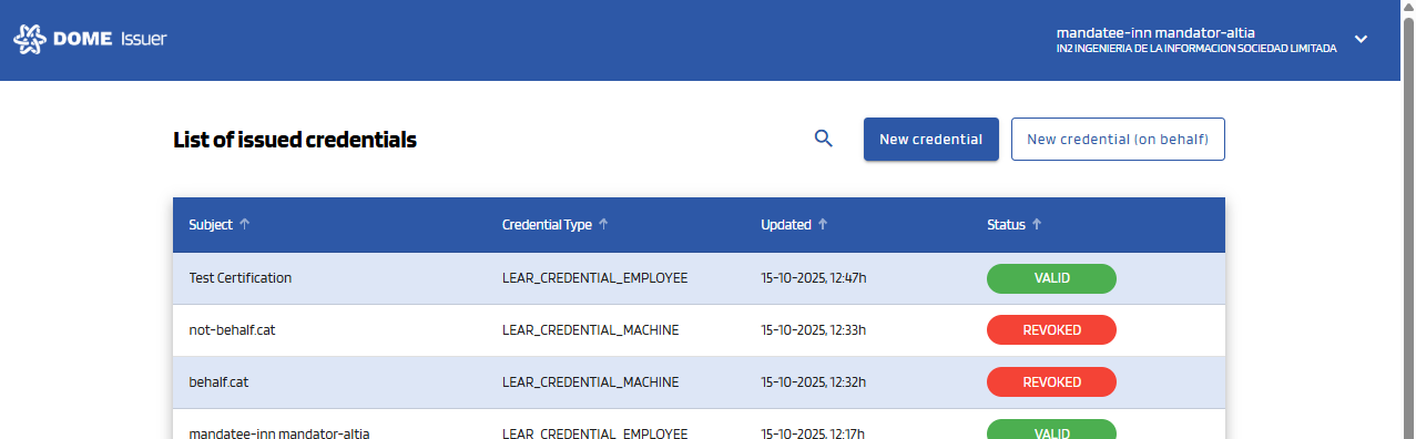 To create a LEAR Credential Machine on behalf of another mandator, click the "New credential(on behalf)" button, at the top right corner of the dashboard page, which will take you to the creation form.
