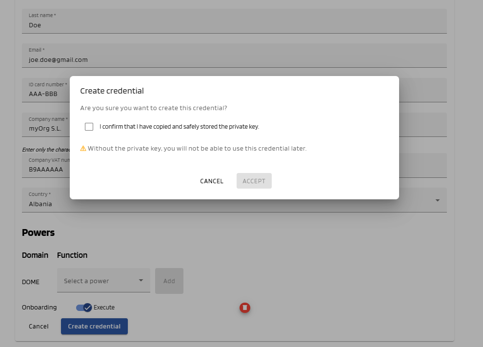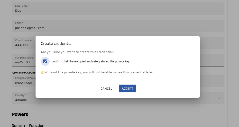 A popup will appear to confirm that you want to create the credential. You will first be asked whether you have copied your private key. Please note that once the credential is issued, it will not be possible to recover the private key, so make sure to store it safely. After doing so, select the confirmation radio button and click "Accept" to proceed. If the issuance is successful, a confirmation message will appear and you will be redirected to the dashboard page.