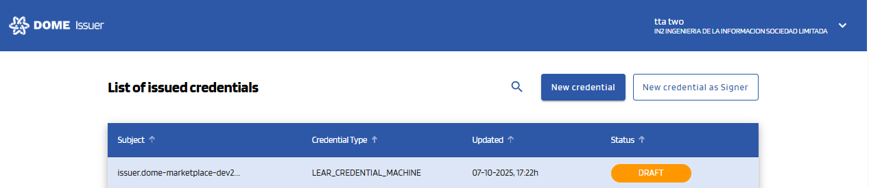 You will see that the Credential you just created has a status of DRAFT. After the user downloads it with the Wallet, it will have a status of VALID (you might have to refresh the page to see it change). For more details, see the Credential Management section.