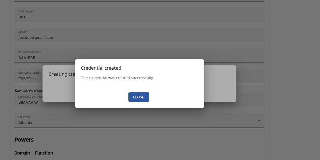 Once all mandatory fields all correctly filled (Private key has been generated, Mandatee filled and Powers added with an action), the "Create Credential" button will become brighter, indicating that it can be clicked. Click on it.