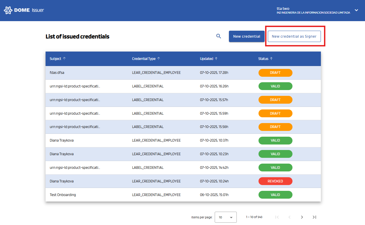 To create a LEAR Credential Machine as Signer, click the "New credential as Signer" button, at the top right corner of the dashboard page, which will take you to the creation form.