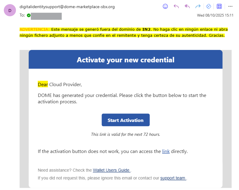Once your company completes its registration in the Marketplace Digital Wallet and receives confirmation, you will get an email within a few days containing a Credential Offer. (NOTE: Although it is called a “Credential Offer,” accepting it is mandatory to activate your CSP account in the Marketplace. Without completing the credential generation process (i.e., accepting the offer), you will not be able to operate your account, even if you have already signed the Marketplace Contract for Cloud Service Providers.)
